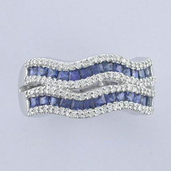 Shown here is an 18K white gold ring with a ruffle wave design boost elegance. The square-cut sapphire stones go perfectly with the dazzling white gold band. This white gold ring is a young and smart accessory to wear with casual dresses.