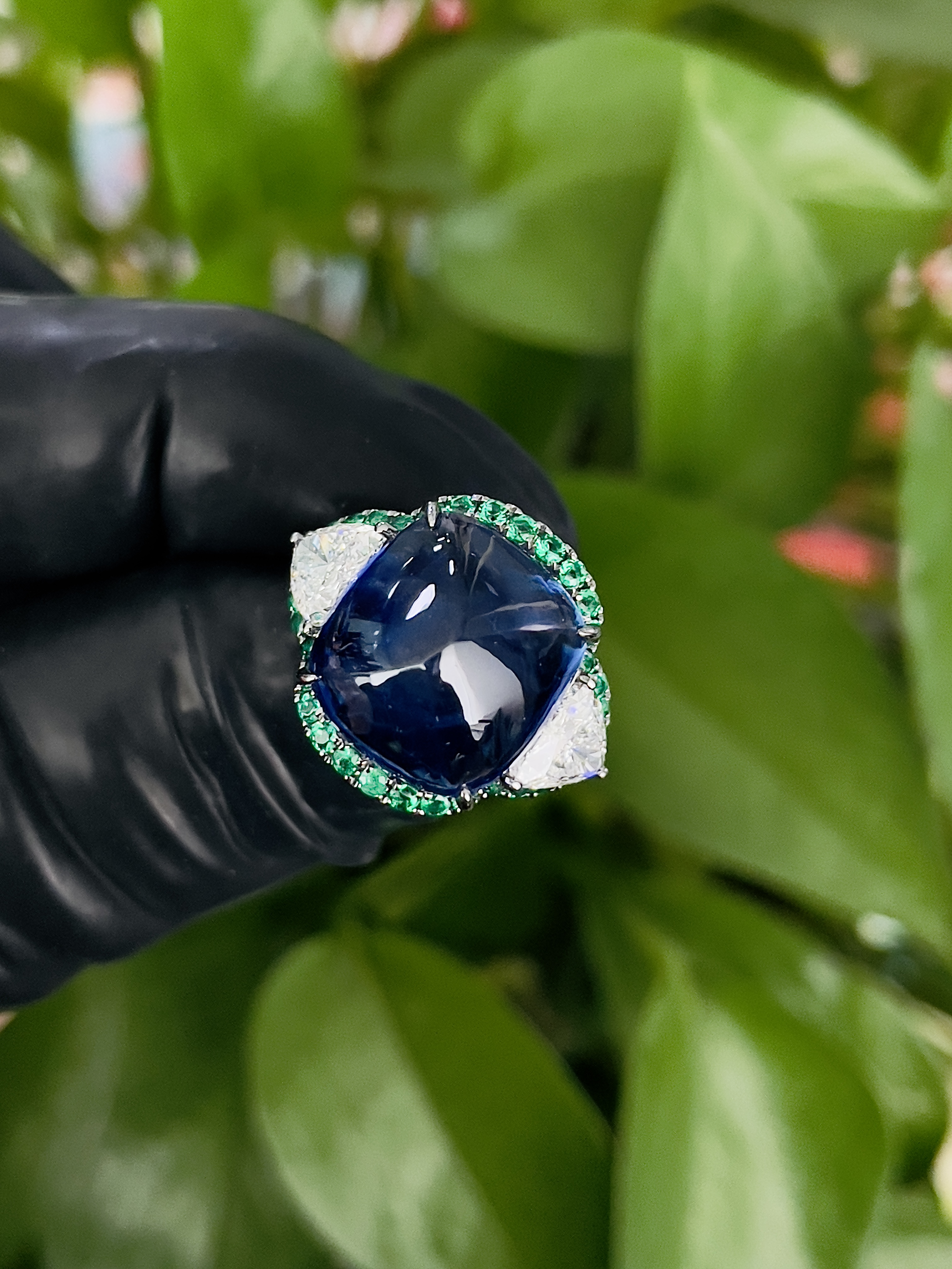 Flanking the sapphire are two triangular diamonds totaling 1.10 carats, their sharp geometry enhancing the sapphire’s depth while symbolizing strength and eternity. A delicate constellation of eight round brilliant diamonds (0.07 carats) adds subtle sparkle, while a halo of 34 round emeralds (0.46 carats) encircles the centerpiece in vibrant green, evoking renewal and harmony.
