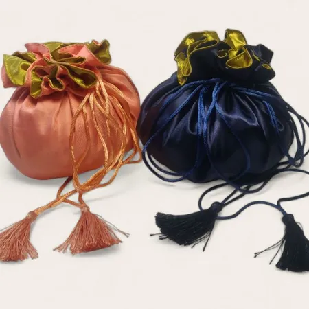 This is a very elegant straw pouch, with double side round base satin, over hundreds of satin and straw cord color for mix and match. Size subjects to customer requirement.