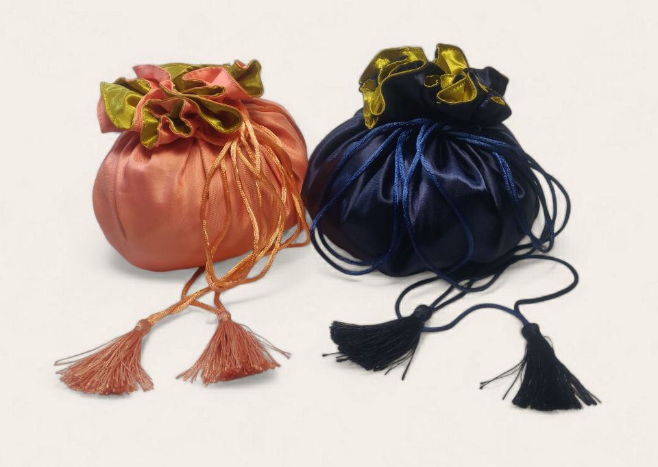 This is a very elegant straw pouch, with double side round base satin, over hundreds of satin and straw cord color for mix and match. Size subjects to customer requirement.