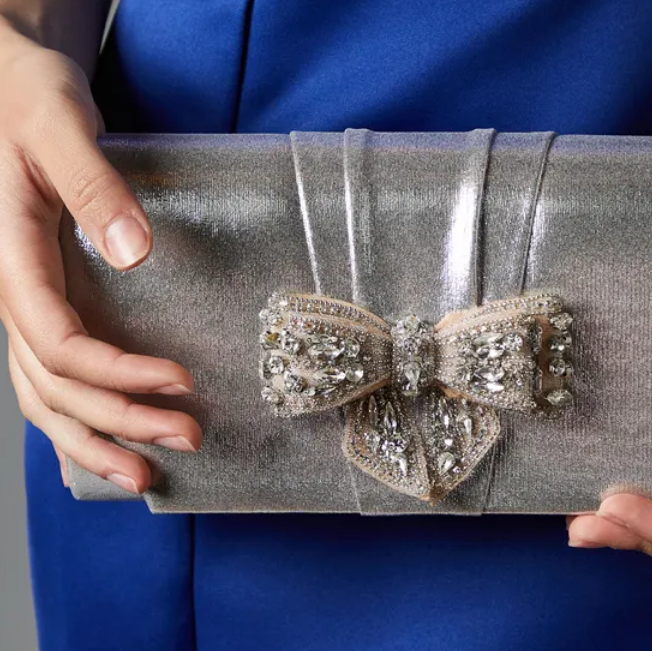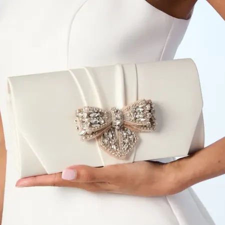 • Luxurious satin clutch bag adorned with a statement diamante bow embellishment