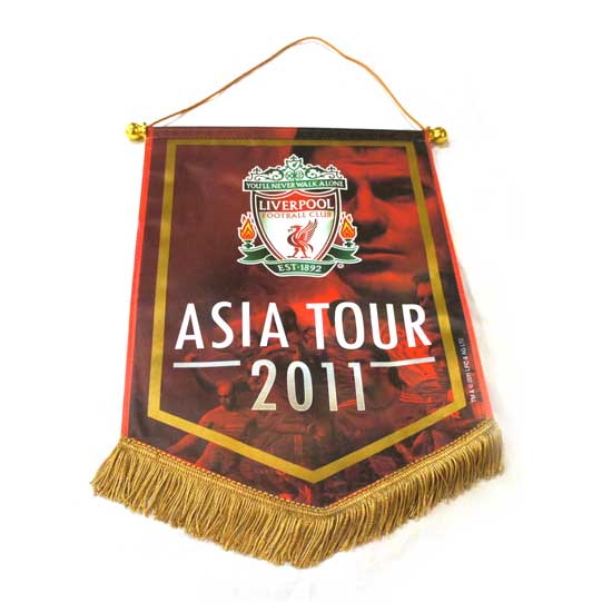 This red pennant features a football team motif. The colorful flag is designed with white lettering and the Liverpool’s logo for a touch of uniqueness. The golden tassel at the bottom lends extra style to the appearance.