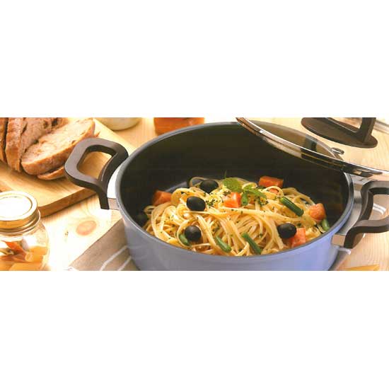 This stylish sauce pan features a round construction in black. It boasts a tall-linear exterior wall and 2 handles for easy use. This functional sauce pan is suitable for making a large variety of cuisines.
