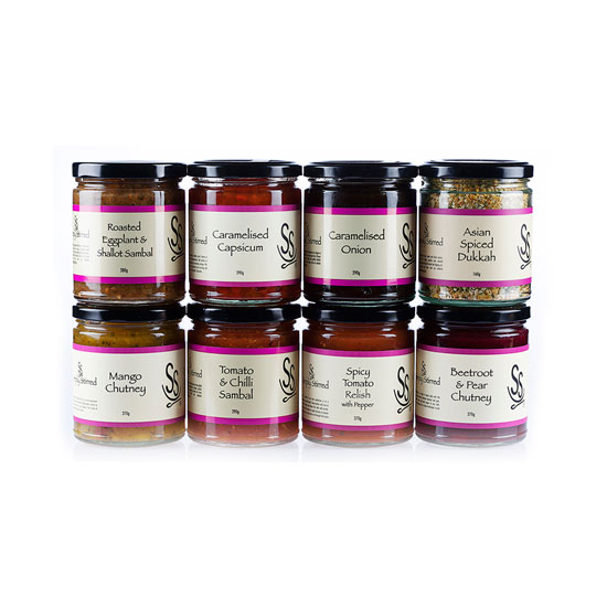 Range of gourmet condiments: caramelized onion, caramelized capsicum, beetroot and pear chutney, dukkah and others.