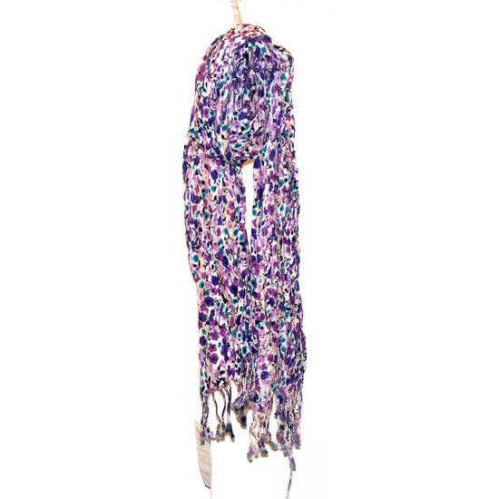 This is a draped scarf for ladies and women. It features flowers of different colours such as purple and blue on a white background. There are also fringes on both ends of the scarf.