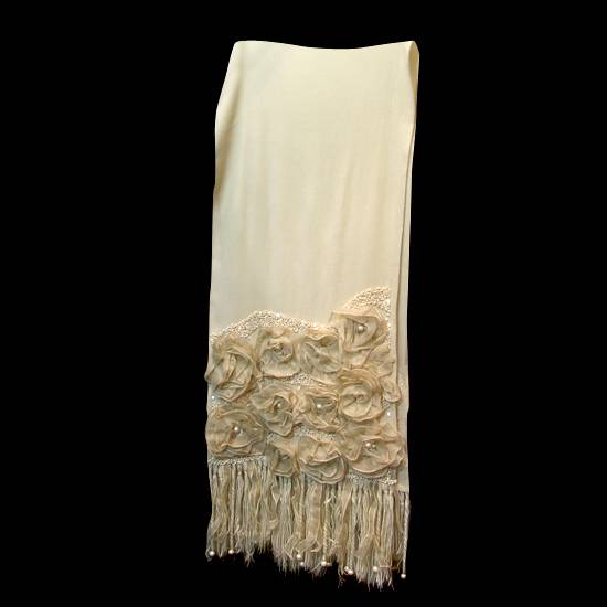 This khaki scarf is 100% made of high quality wool. It is decorated with hand embroidery, laced flowers with beads and fringes. This scarf is a good clothing accessory for ladies and it keeps ones warm in cold weather efficiently.