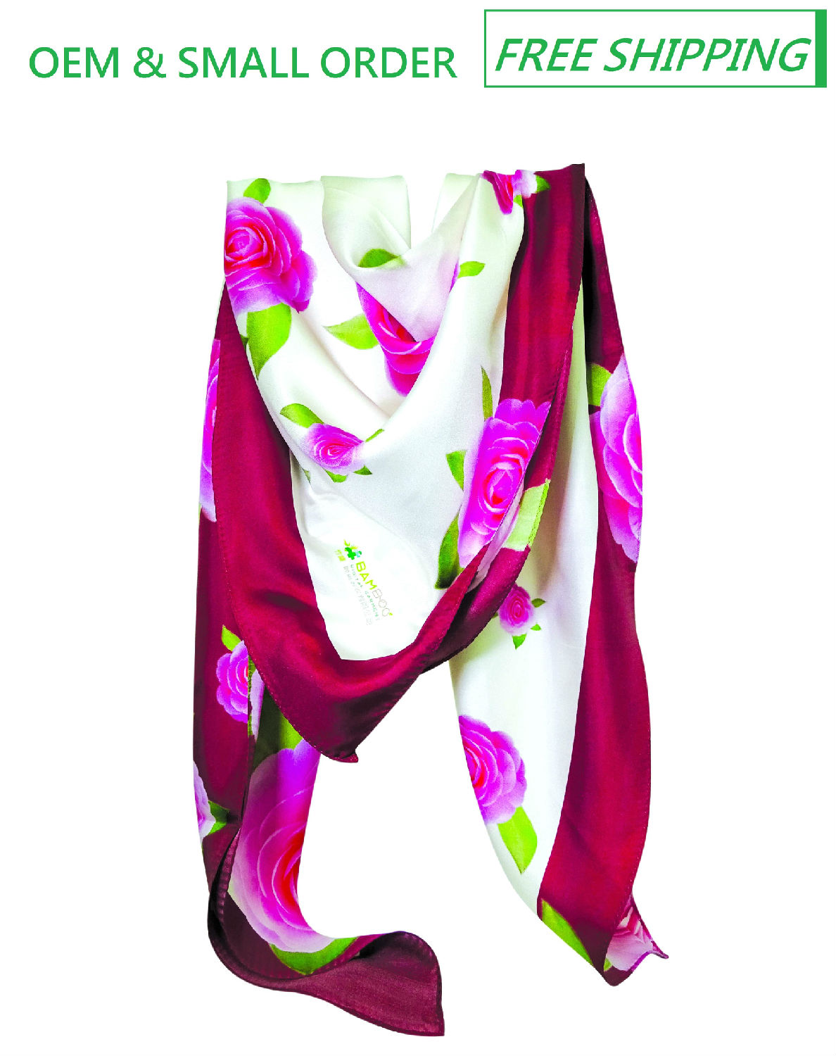 Our team is able to source the best quality of 100% authentic silk found in China and will be able to digital print the OEM design on the silk scarf.