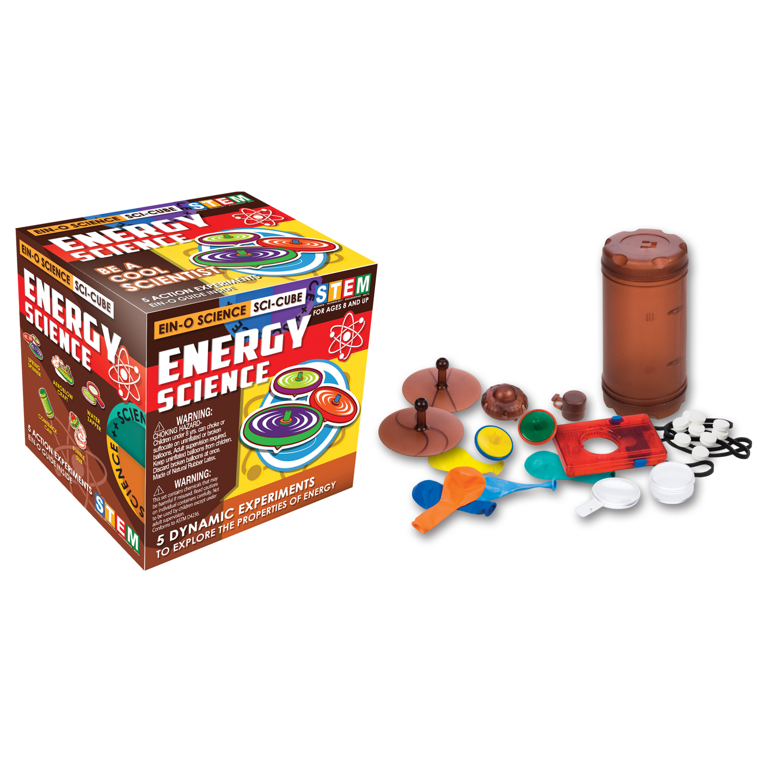 Investigate the dynamic properties of energy with this Science Cube. Have fun with these 5 energetically-charged experiments – “Bubble Sub”, “Spring Spinner”, “Water Zapper”, “Aeroblow Craft” and “Comeback Can”. It is an excellent STEM toy for teaching kids and can enlighten their interest to science.