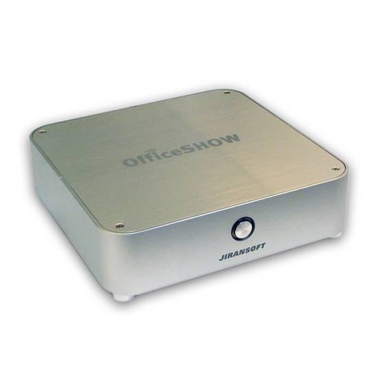 This is a screen share server. It has a minimalistic design of a metallic case with one button in the center. The OfficeSHOW device can share the screens for video signals from any machine like the presenter.