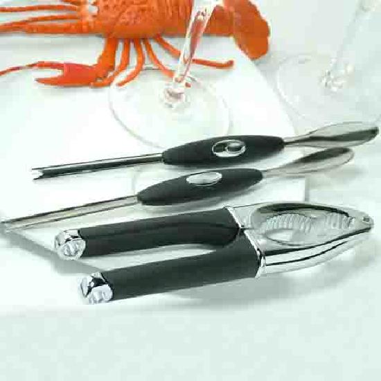 Displayed is a seafood cracker and pick set. This stainless steel seafood tools are in solid zinc alloy die cast with chrome plating for breaking the hard shells of lobster. The handles of these seafood tools are wrapped with soft grips for comfortable use.