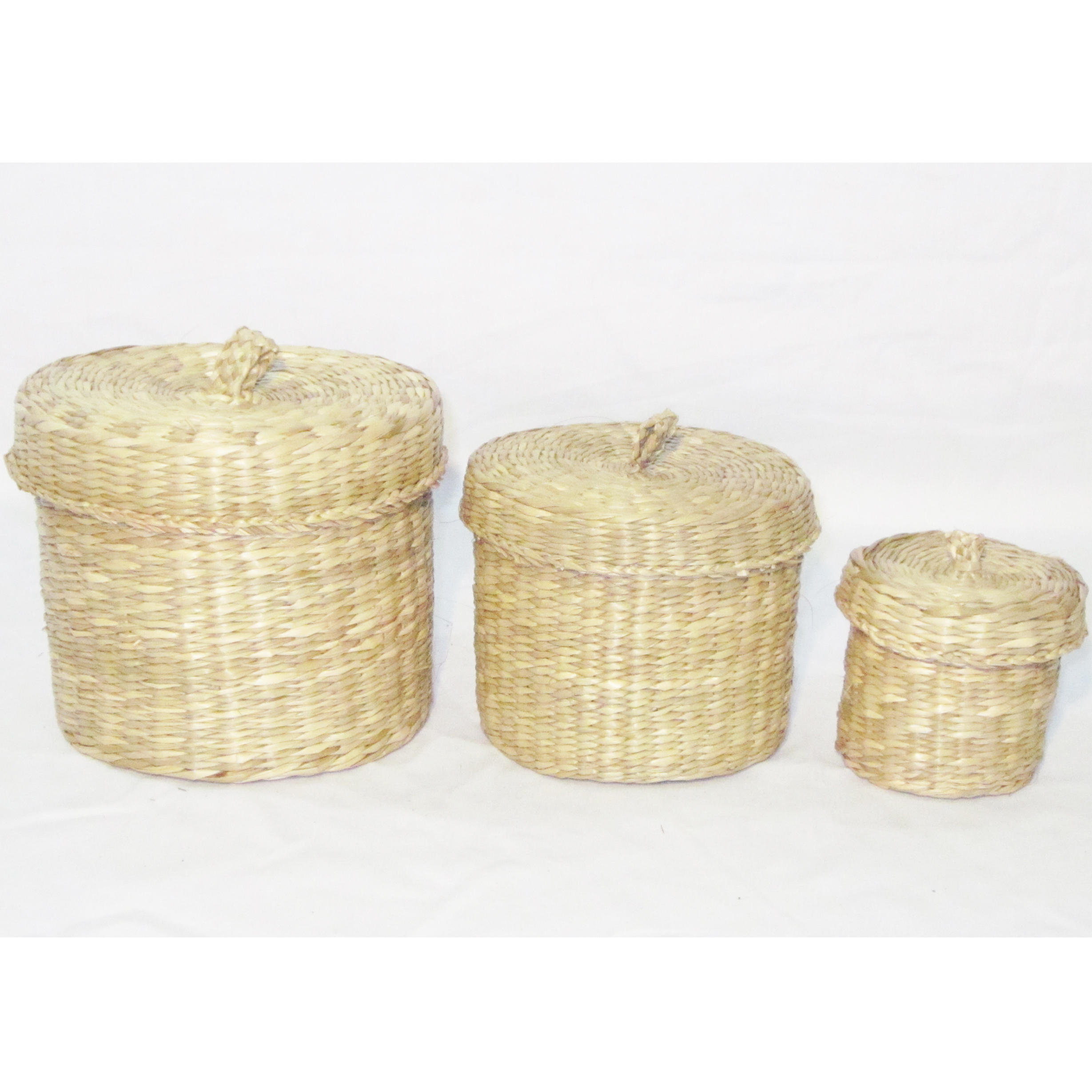 Round seagrass boxes with lid. Natural color. Straight shape.