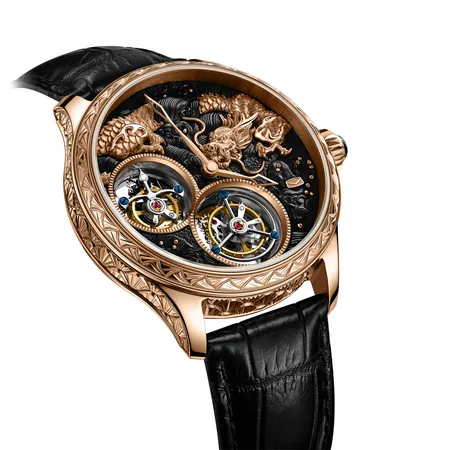 "The majestic dragon dominates the dial, its scales meticulously rendered through hand-chased gold engraving and fine sculpture. Powered by Seagull's in-house ST8080 dual tourbillon movement, this timepiece is a masterpiece where Chinese aesthetic philosophy converges with pinnacle watchmaking artistry."