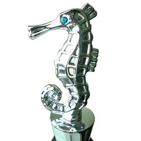 Pictured is a wine stopper in a seahorse’s look. The little seahorse features eyes made with blue Swarovski crystals for a touch of style. This wine stopper is made of chrome-plated zinc alloy with silicon rings for added durability and performance.