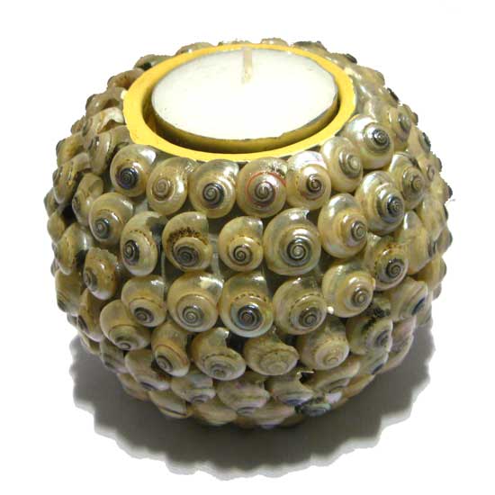 The candle holder comes in a ball shape. It is decorated with seashells to add a decorative touch. This candle holder makes a great decorative item for modern homes.