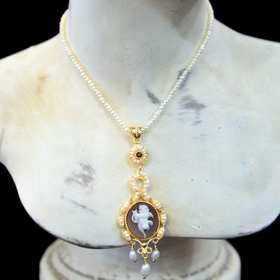 This is a necklace with a sophisticated and deluxe design. It features a golden pendant and a white pearl chain. The pendant comes with a vivid girl centerpiece and assorted pearl accents.