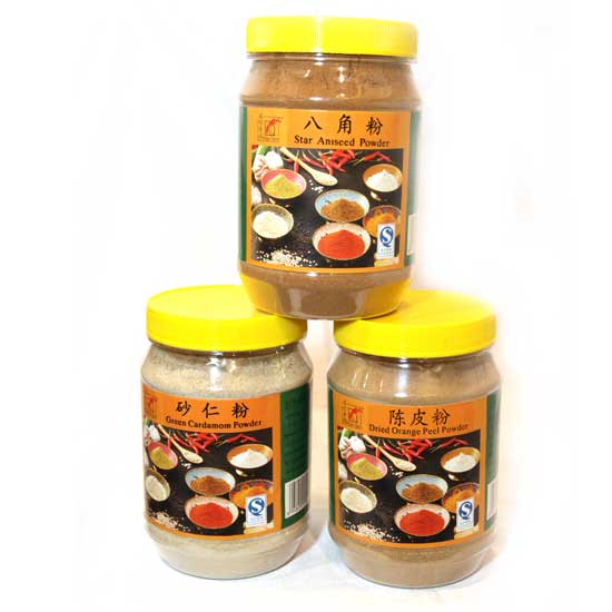 Shown here is green cardamom powder, star aniseed powder and dried orange peel powder. The finely grounded seasoning powder can be added into soups or dishes to enhance the flavor. The seasoning powder set makes a great addition to every kitchen.