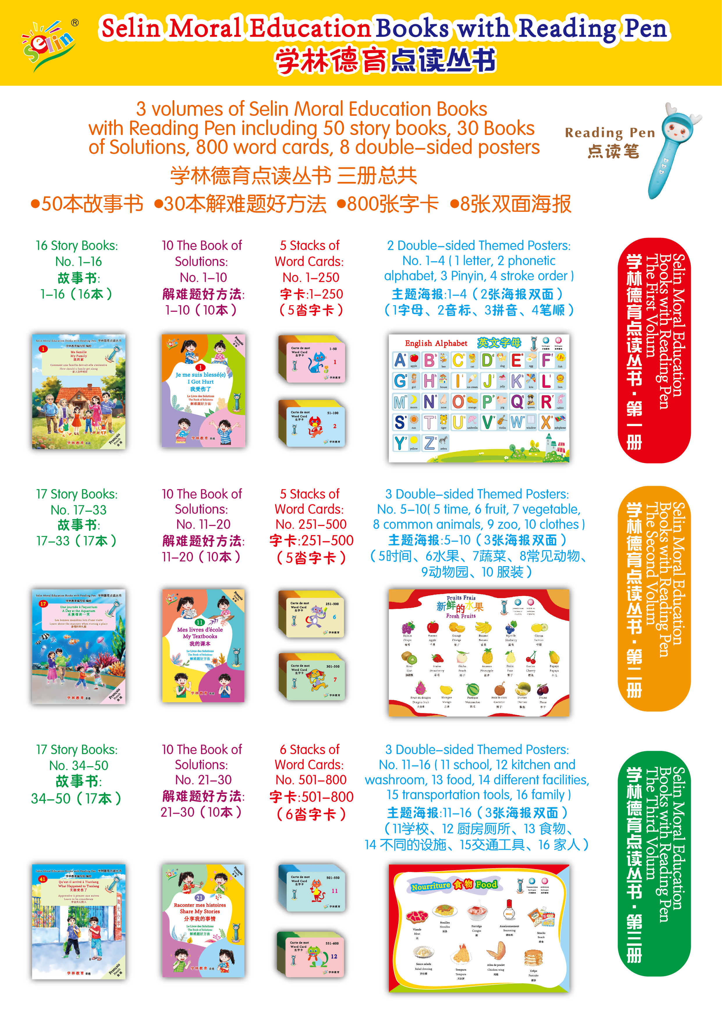 This is a 3-volume book set and the first volume is available now, which consists of 16 Story Books, 10 Books of Solutions, 250 Word Cards, 2 Posters and 1 Reading Pen (with record function).