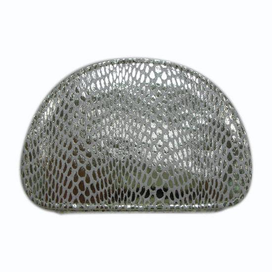 The cosmetic bag features a semi-circular shaped bag body with a zip-top closure. It is finished with an embossed snakeskin pattern in metallic tone for a unique touch. This pretty cosmetic bag allows you to carry your daily necessities in style.