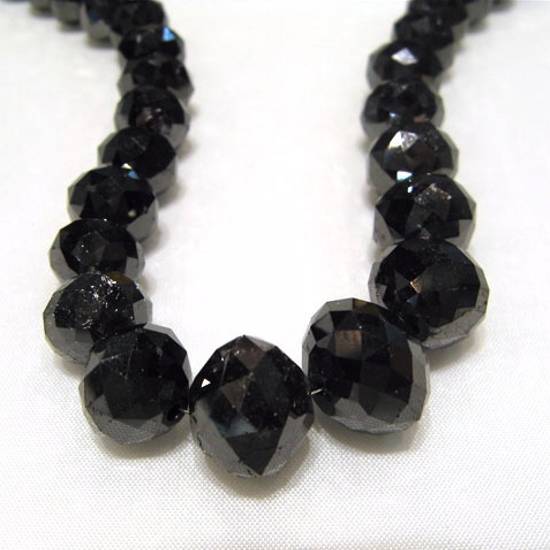 This is a piece of semi-precious necklace, featuring faceted round-cut black stones in graduated sizes. The faceted cut allows the necklace to reflect light and gives a glittering look.