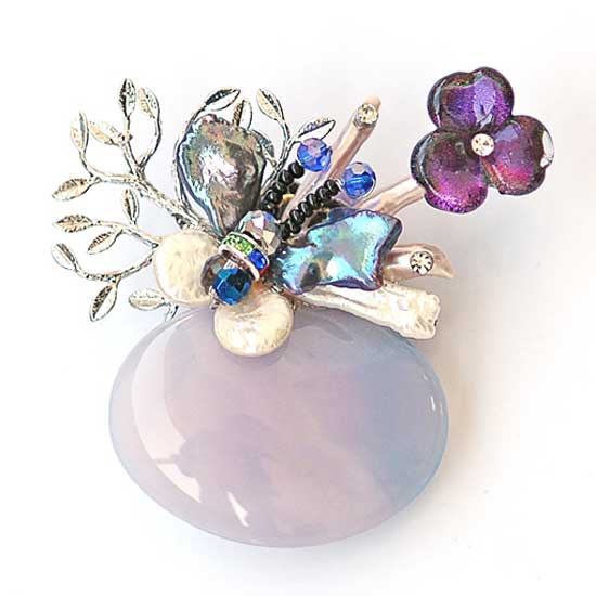 This outlined brooch is set with agates and a fresh water pearl. The delicate details showcase a refined accent. This semi-precious stone brooch is great for pairing with assorted outfits.