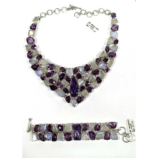 This jewelry set comes with loose semi-precious stones in purple and white delicately embedded. The sterling silver promises a long serving time. The necklace and bracelet are excellent fashion accessories for parties, balls and so on.