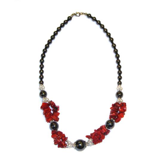 This is a semi-precious stone beaded necklace for ladies and women, which is threaded with round black hermite, irregular red coral and glass pearl beads. The contrasting colours gives an eye-catching and vibrant style which is suitable for matching fashion wear.