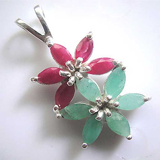 The delicate pendant touts a fancy floral design accented with glamorous ruby and emerald. It is finely crafted with excellent workmanship and adorable details. This floral pendant is subtle enough for day-to-day pleasure, but elegant enough for champagne receptions.
