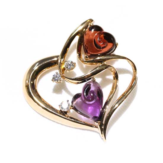 This pendant is designed in a romantic heart shape. It features a rose gold mounting with two heart-shaped gemstones in red and purple. This pendant is a great accessory for your high-end outfit.