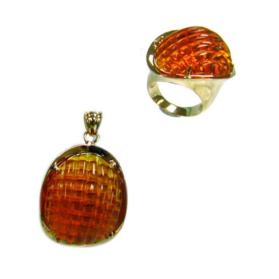 This pendant and ring set boasts an elegant design to please ladies' eyes. The stones are cut into a semi-dome shape, with delicate grid patterns on the surface. Matching with a golden base, this pendant and ring set makes a perfect choice for mix and match.
