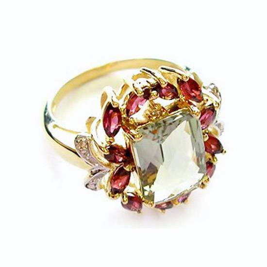 This semi-precious stone ring has a top-quality gold frame. The princess-cut rectangular white semi-precious stone in the middle is distinctive. The red semi-precious stones are arranged to offer a enchanting look.