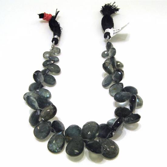 This is a string of semi-precious stones in pear shape. The faceted cut stones are available in graduated sizes for different combination. Its translucent black colour tone gives an high-fashioned and mystic look to the piece of jewellery it is used for making.