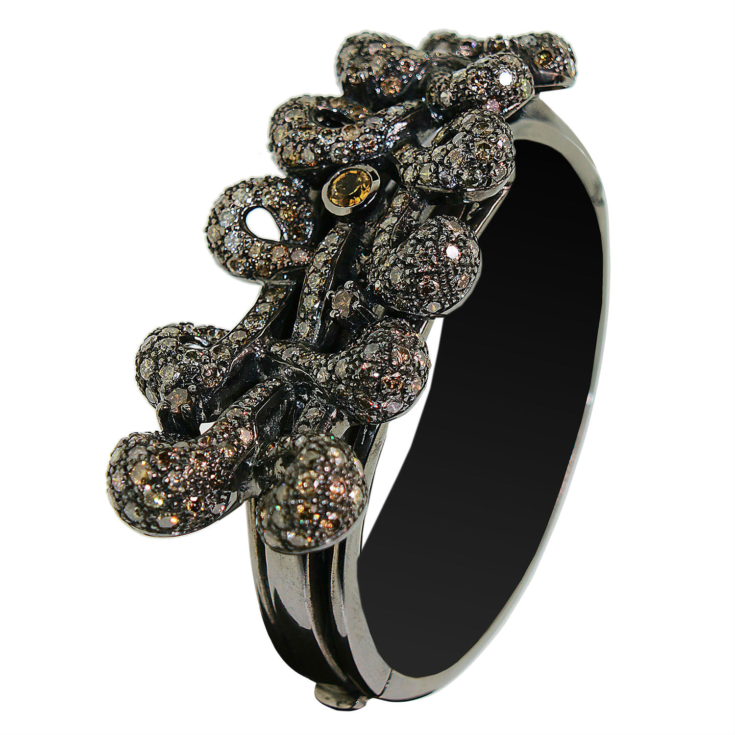 Featured here is a silver diamond bangle in a unique and elegant design. It is embellished with 11.34 carats of brown diamonds and 0.25 carats of citrine. This silver bangle flaunts meticulous craftsmanship and is an excellent gift choice for ladies.