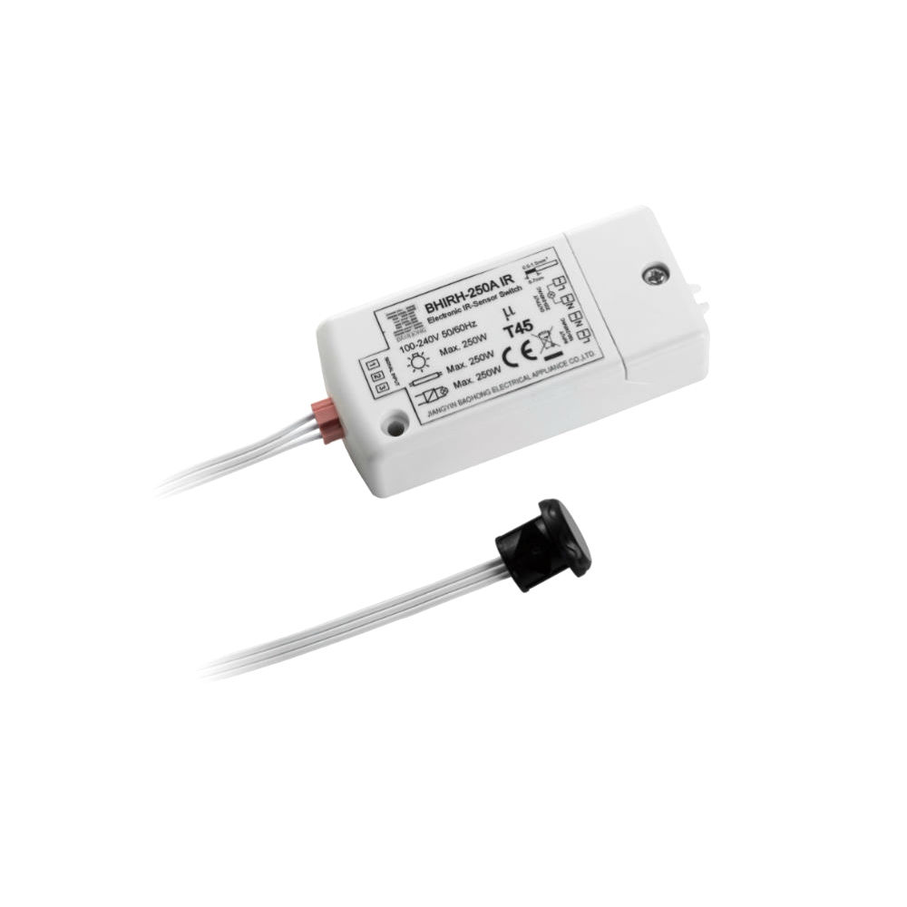 The highlighted sensor has a rectangular shaped housing made of PC. It has electrical information shown on the exterior and comes with long cables for connection. This sensor is suitable for installing outside the cabinet.