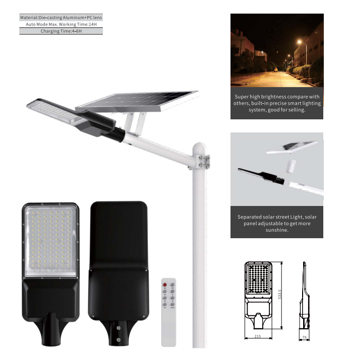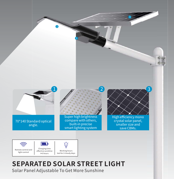 Sparated solar street light,solar panel adjustable to get more sunshine.