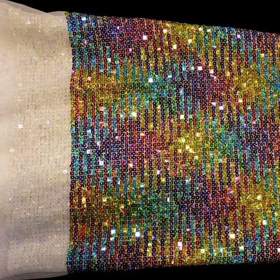 Featured is a fabric fully embroidered with sequin in rainbow colors. This material is a fancy choice of material for garments. This interesting material lends a touch of glamour to any outfit.