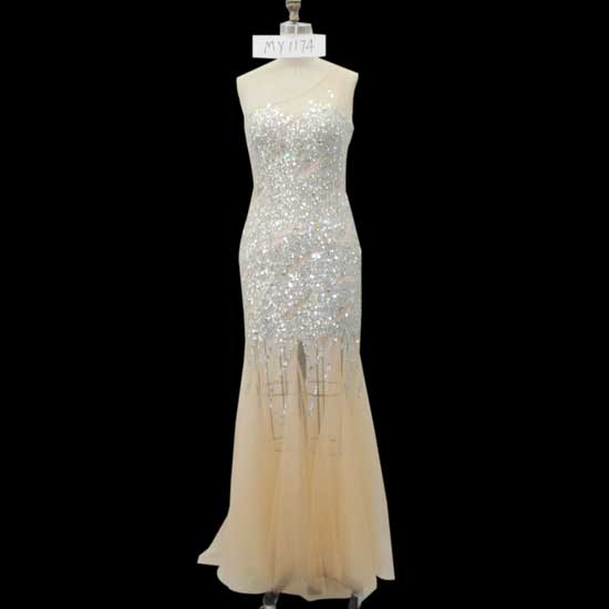 This style would be perfect for a prom or a red carpet event. It features a single-shoulder design with shiny silver-hued sequins at the bodice. The long sheer skirt adds a unique touch to this dress.