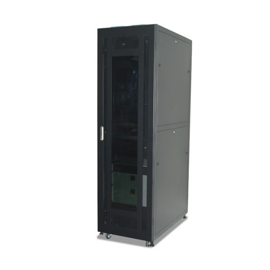 This server cabinet is designed for secure, high-density server and networking applications. The cabinet comes with a reversible front door made of steel and tempered glass. It is furnished with vents designed to help remove warm air and draw in cool air by convection.