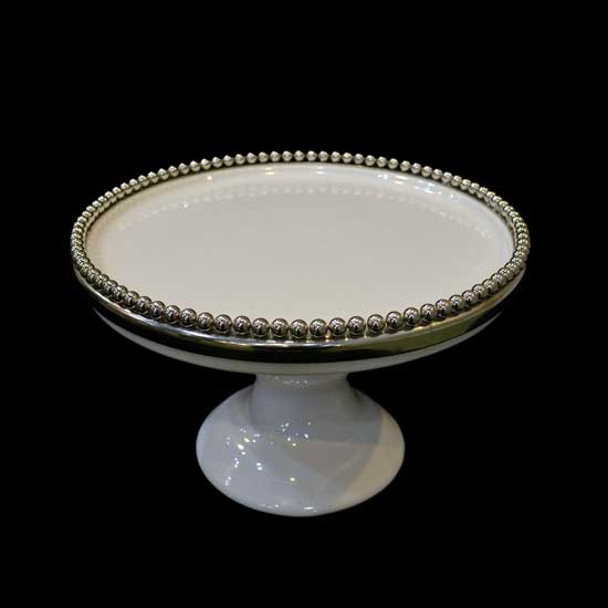 Displayed is a serving plate with a supporting stand. Made of ceramic, this plate features a shiny silver bead bounding. This beautiful serving plate will make you enjoy your meal even more.