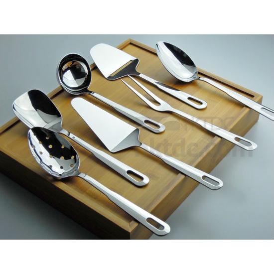 - A set of 7 serving tools: 1 ladle, 1 fork, 1 cake server, 1 cooking spoon, 1 slotted spoon, 1 cheese slicer and 1 serving spoon.