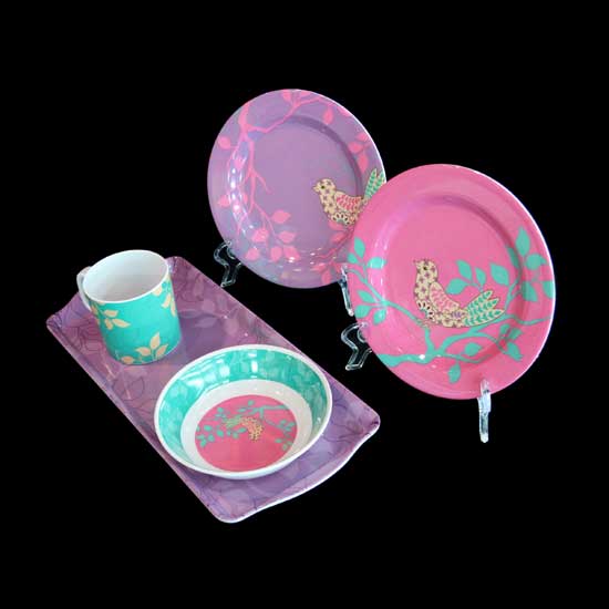This is a five-piece serving set including two plats, a cup, a bowl and a tray. This serving set is made of quality melamine. This chic serving set with colored prints is a great addition to your dining table.
