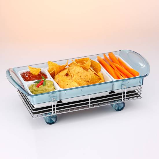 This is a multi- functional serving tray. The tray includes 4 compartments and wheels underneath. The compartment are formed by four white plastic dish. They can be changed around according to your preference.