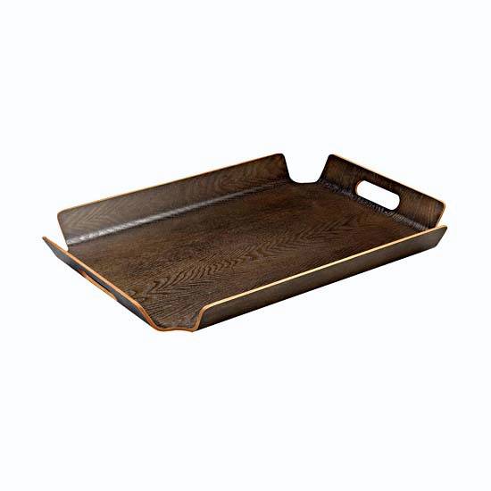 This is a serving tray featuring a stylish and innovative design. The tray has a smooth cut-out handle and a well-designed surface that prevents spilling. Serve a delicious meal with this convenient tray.