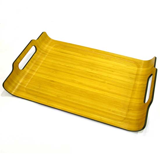 Featured here is an elegant serving tray that is made of bamboo. This excellent serving tray is designed with two durable handles. This fine tray is an essential tool for restaurants and kitchens.