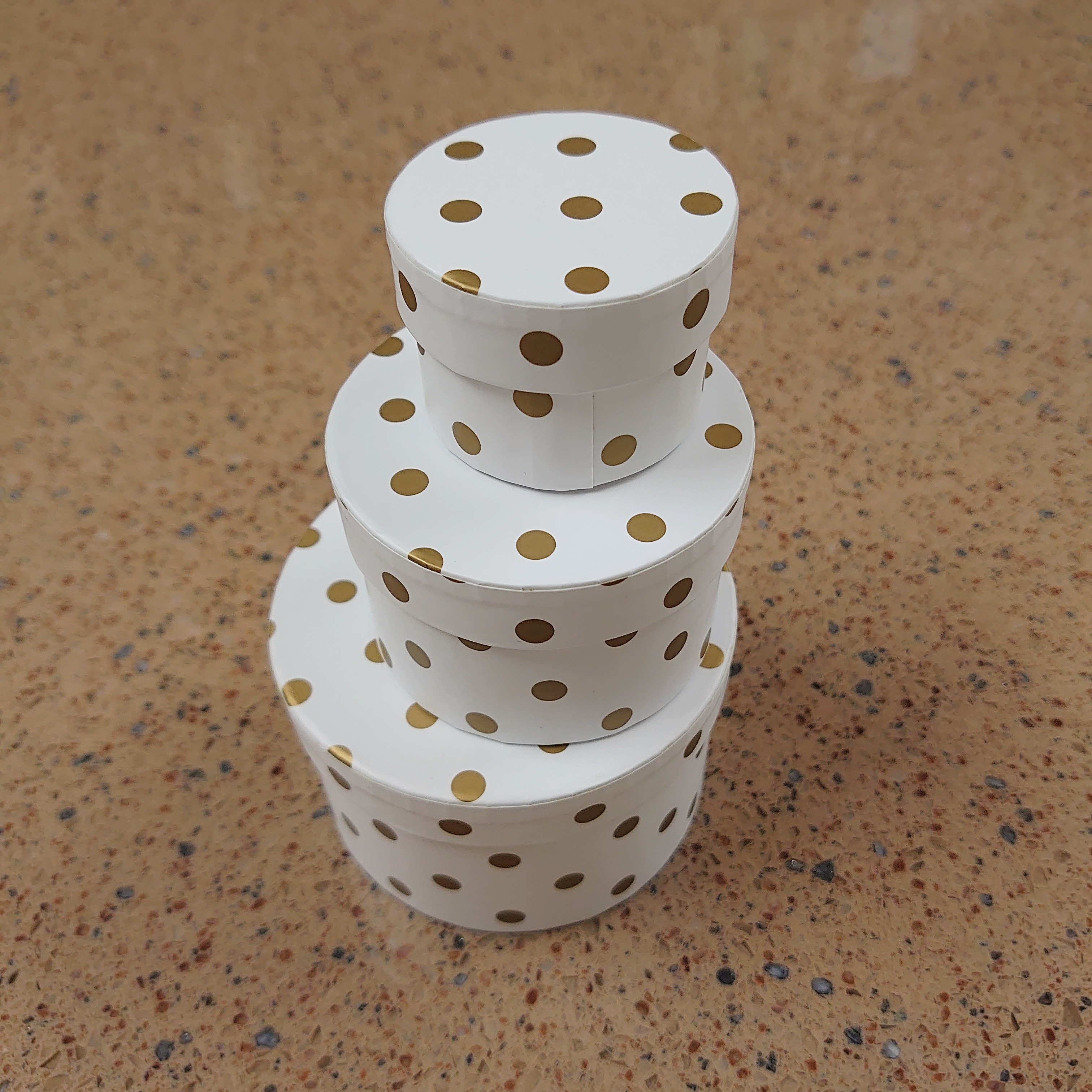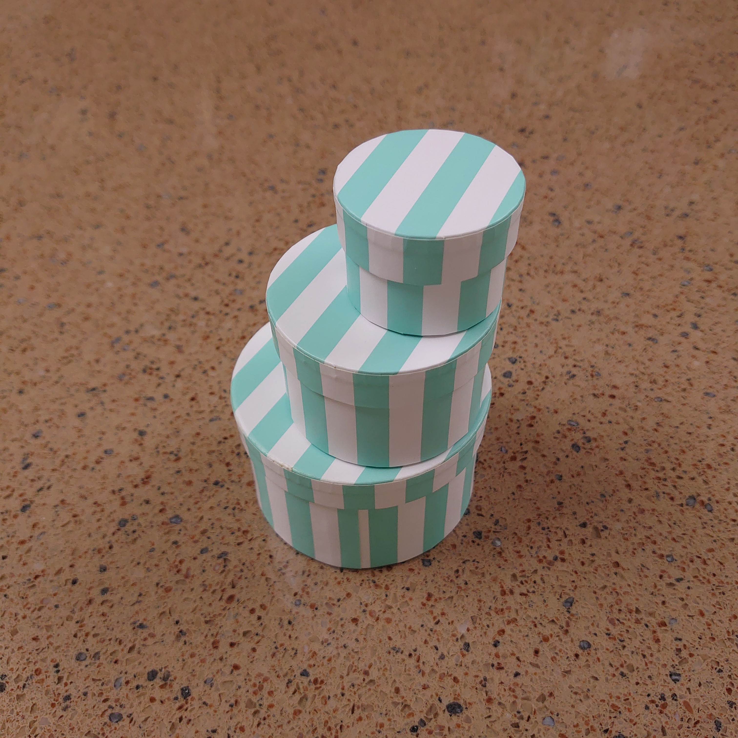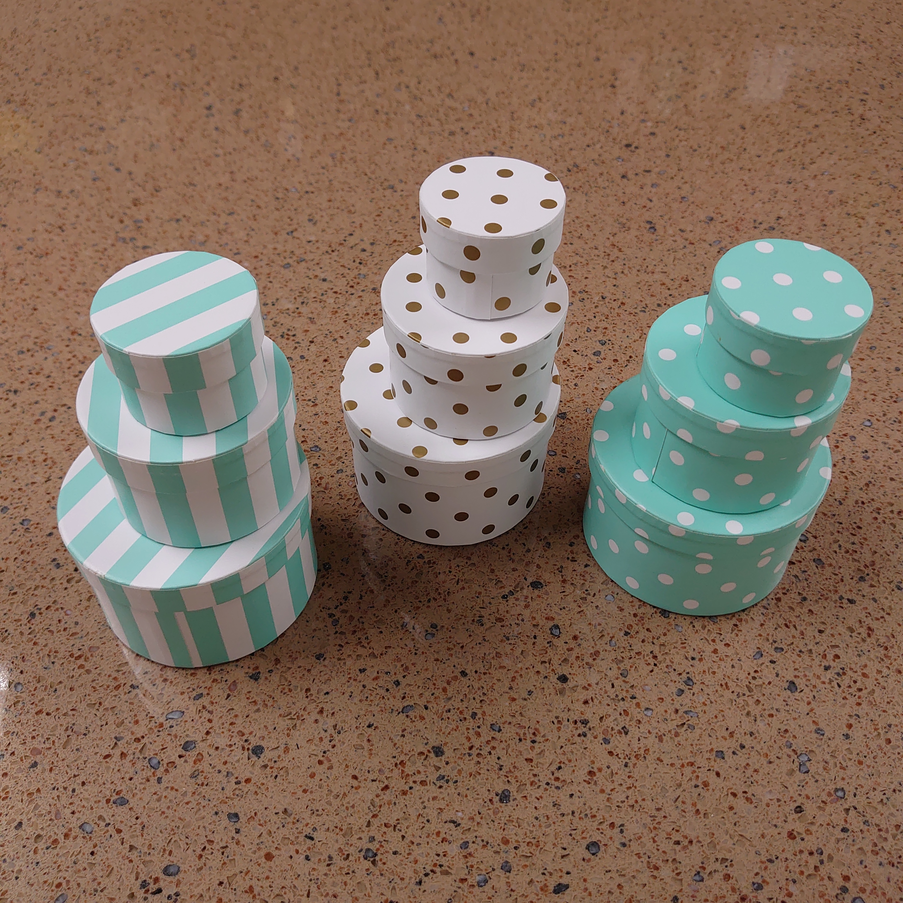 Set of 3 round boxes. This fashionable box is made of paper for durability.