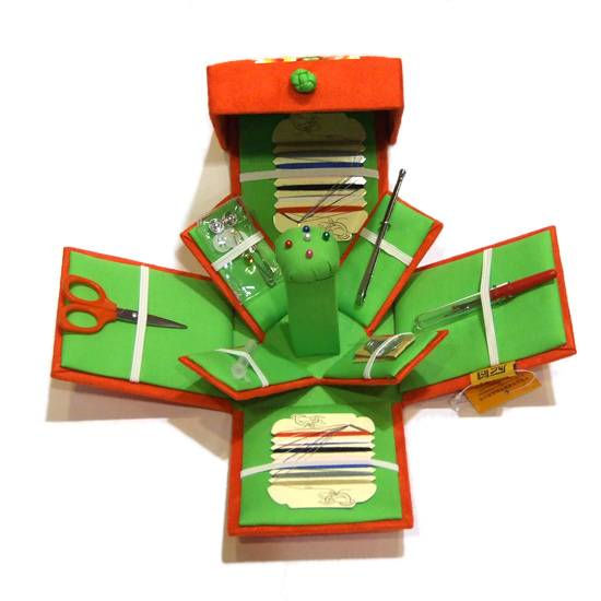 The item shown on the picture is a sewing box equipped with different sewing accessories, including a pair of scissors, needles, threads, buttons and pins. It is space saving and also classical in design.