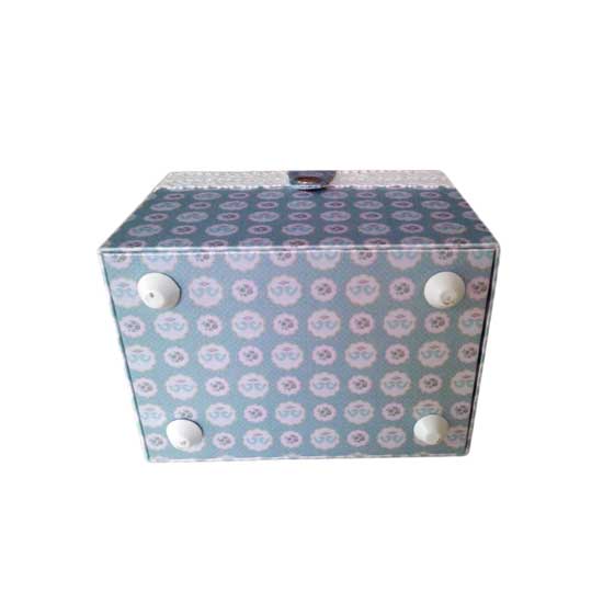 This is a sewing box that is accented with colorful patterns for a decorative touch. The interior comes with several compartments for storing different items neatly. The top handle allows easy and convenient carrying.