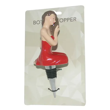 Sexy Lady Bottle Stopper, Brown Hair & Red Dress