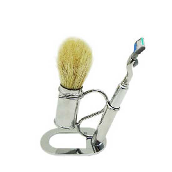 This shaving set includes a razor, a shaving brush and a holding stand. The items feature well-polished silvery surfaces. The finely manufactured set guarantees a long lifespan.