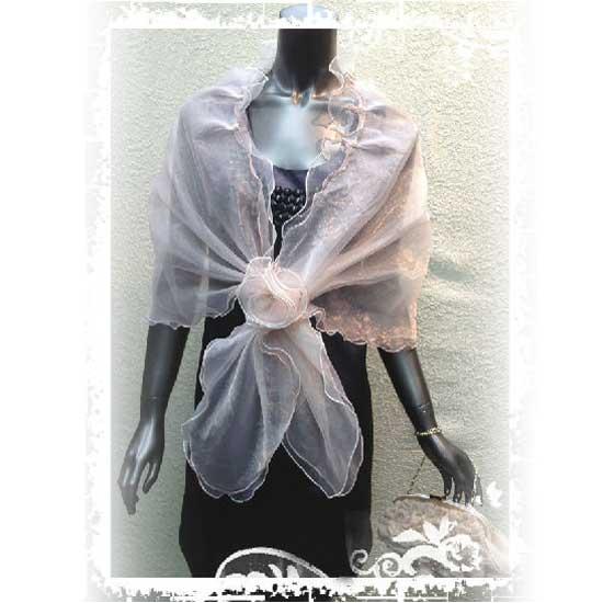 This is a ladies' shawl and evening bag set with a matching design in attractive pink. The stylish shawl features a double-layer organdy with floral trimming for a sense of cuteness. With an elegant and feminine design, this evening bag is suitable for use on different party occasions.