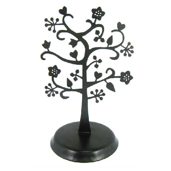 This sheet metal jewelry holder features an engaging tree appearance. It is finished with a black powder coating. This piece is also available in any color.